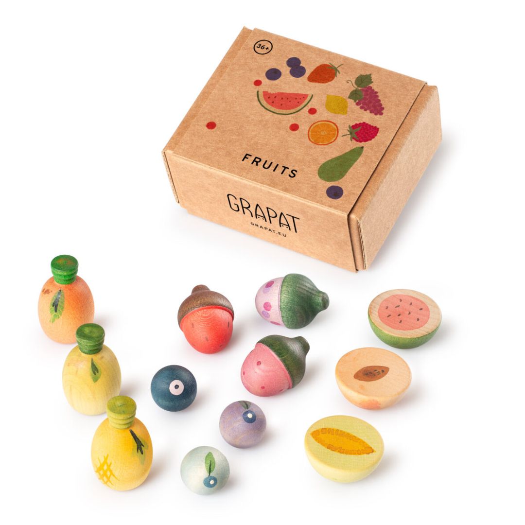Set of wooden fruit toys with a 'Grapat' branded box on a white background