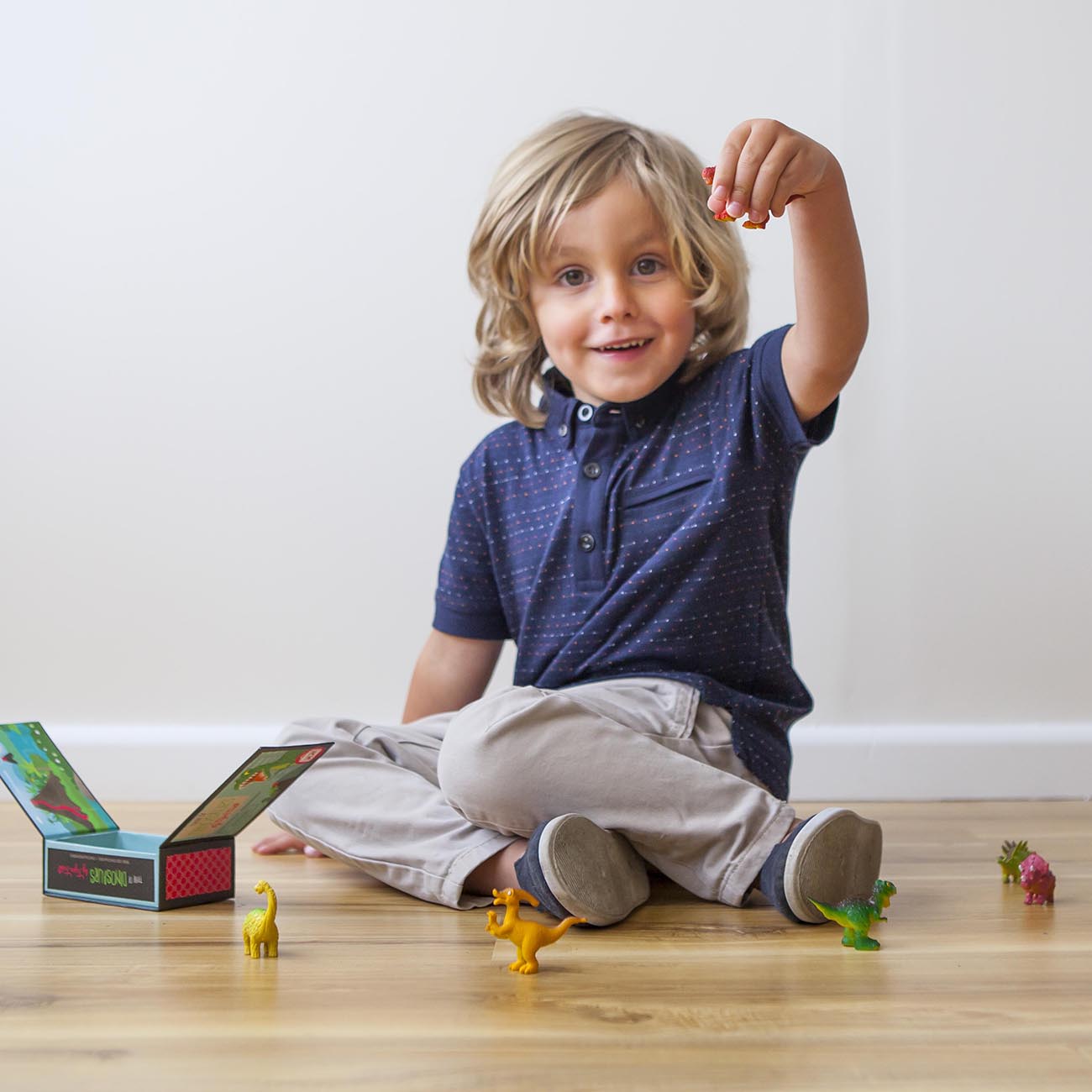 ready to stomp, chomp and roam in their very own illustrated prehistoric world. The cleverly designed box transforms into a vibrant backdrop, making setup easy and clean-up even easier.