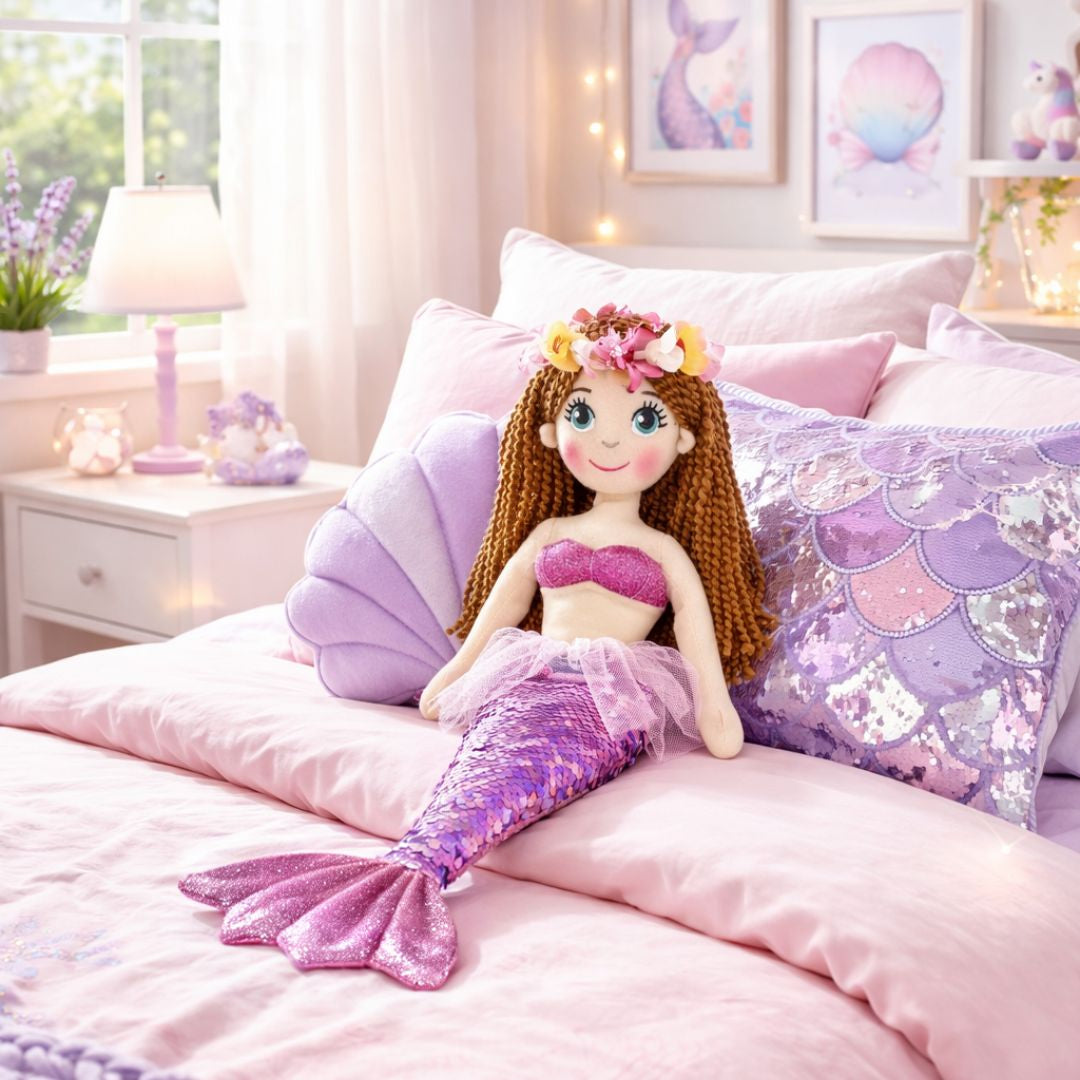 Designed with durability and softness in mind, this 45 cm mermaid doll is ideal for imaginative play, nursery styling and meaningful gifting. Her fully stitched features make her safe for snuggles, while her premium fabrics ensure she remains a keepsake for years to come.