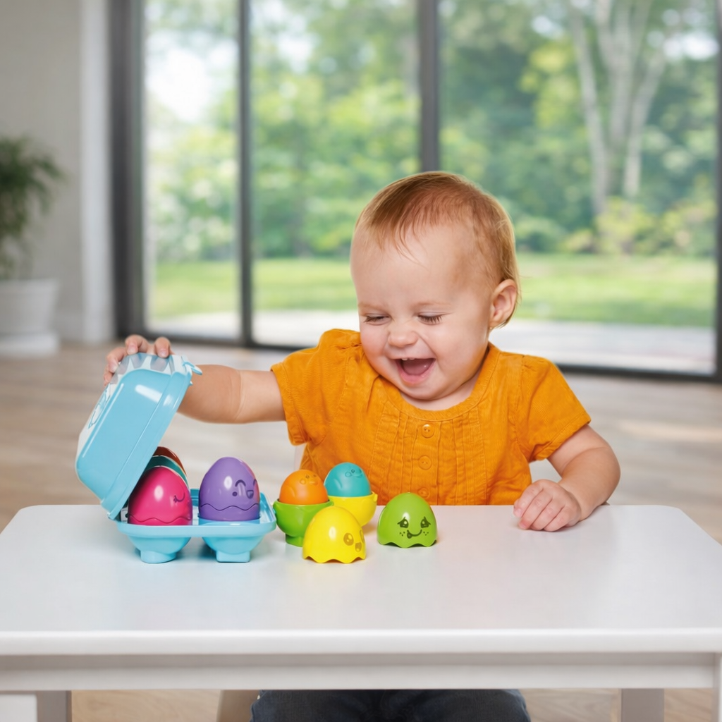 Tucked neatly inside a sturdy bright blue egg box, you will find six colourful eggs in pink, purple, green, yellow, teal and orange. Crack them open to reveal adorable chicks inside, ready to squeak, rattle and delight curious little hands. Designed for babies from 6 months and up, this engaging sensory toy grows with your child through every stage of early development.