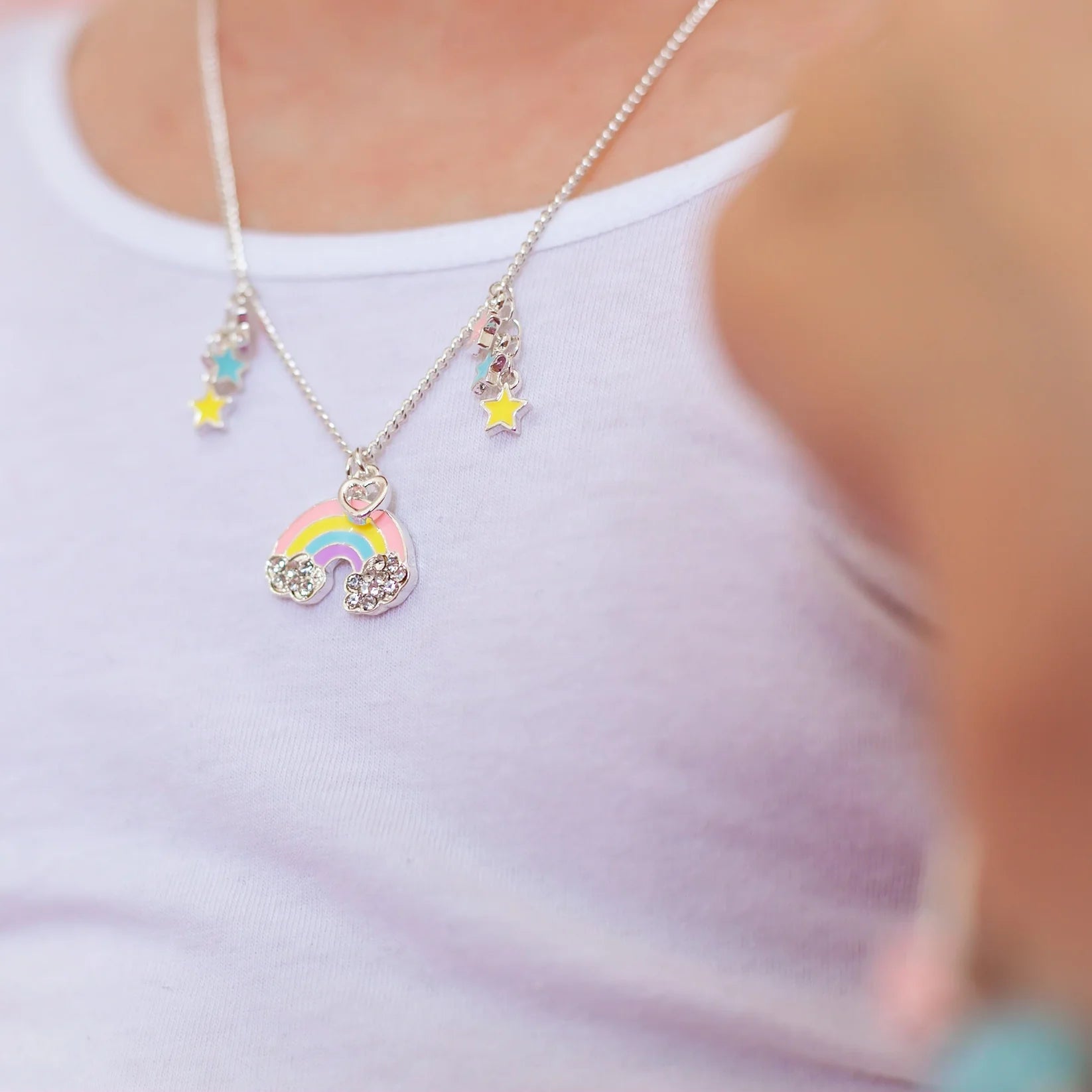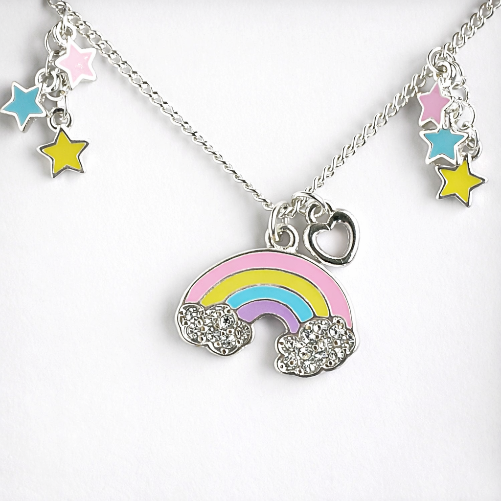 Step into a lullaby land where rainbows shimmer, clouds feel soft, and glittering stars light the way. The Somewhere Over the Rainbow Necklace is a joyful keepsake designed for dreamers whose hearts are set on the stars. With endless colour, sparkling diamantés and a delicate silver heart charm, this necklace captures the magic of childhood wonder in a piece that can be treasured every day.